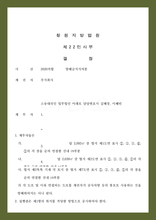 부지조성공사 공사차량 출입을 막는 주민들의 방해행위를 금지하는 방해금지가처분이 인용된 사례[김해붕 대표변호사]업무사례/보전소송(가압류,가처분) 2021. 1. 31. 00:14